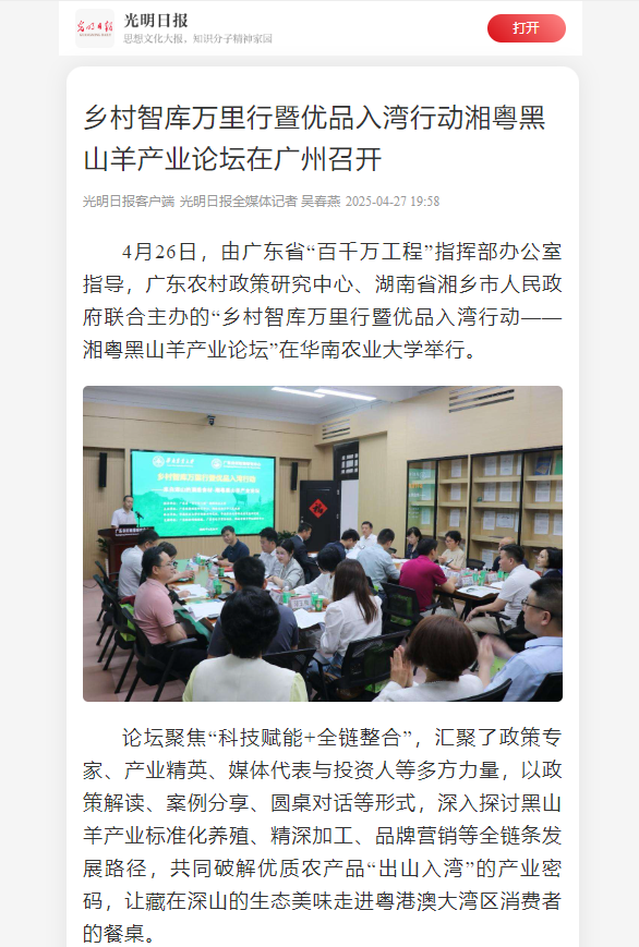 4月26日,由广东省“百千万工程”指挥部办公室指导,广东农村政策研究中心、湖南省湘乡市人民政府联合主办的“乡村智库万里行暨优品入湾行动——湘粤黑山羊产业论坛”在华南农业大学举行。